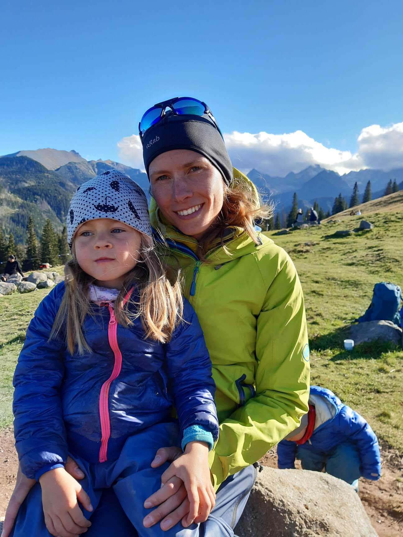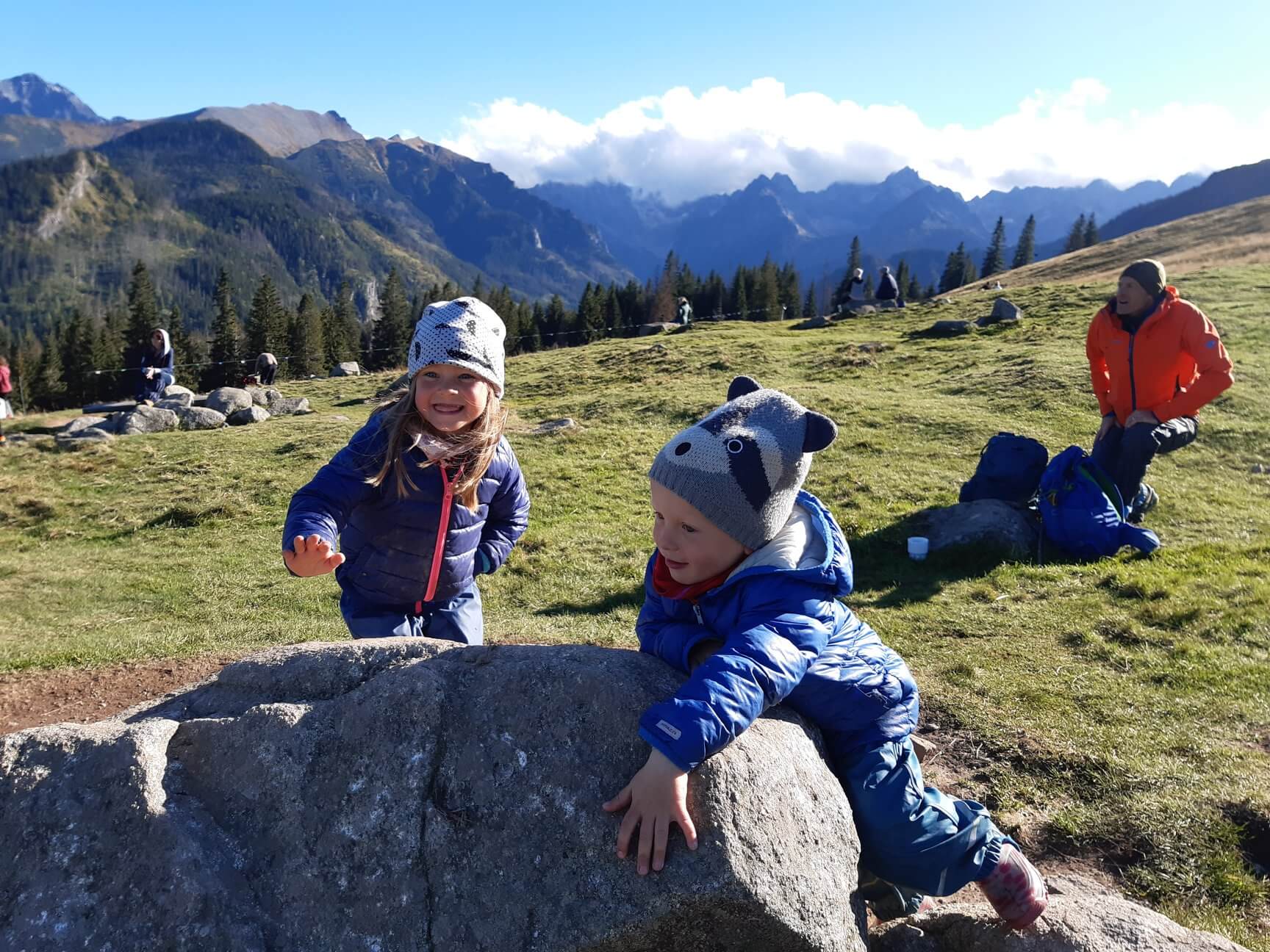 Słońca byliśmy tak spragnienie, że siedzieliśmy, leżeliśmy, relaksowaliśmy się tam ze 3 godziny. Dzieciaki zajęły się sobą bawiąc się na leżących wszędzie głazach. Mogliśmy na spokojnie z Natalią posiedzieć i rozmarzyć się podziwiając wyłaniające się zza chmur kolejne szczyty. Mały ból w sercu. W zimie ostatni raz wspinałem się na miesiąc przed urodzeniem Maliki, letnie Tatry ze 3 lata temu. Coś za coś. Na razie wspólne podróżowanie, maksimum czasu z dzieciakami, żeby od nas chłonęły…