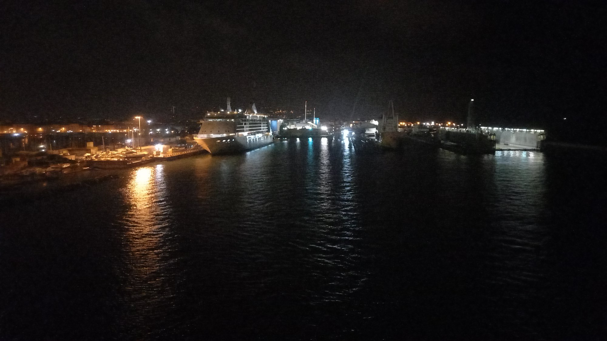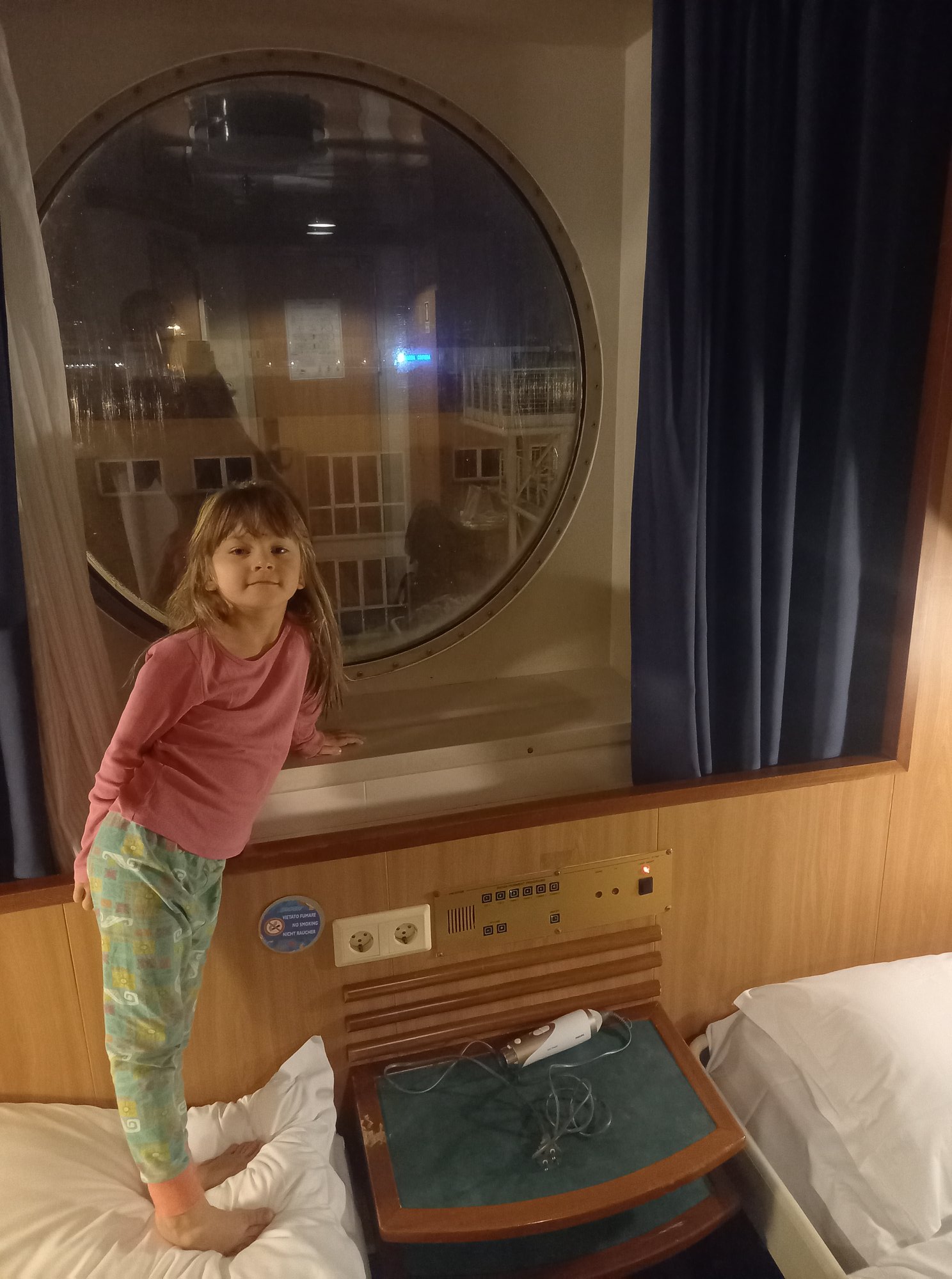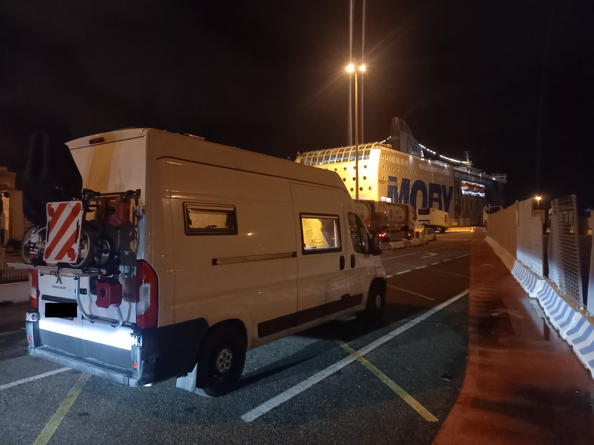 Tak dużym autem nie wjeżdżałem na prom, tym bardziej nie parkowałem w takiej ciasnocie. Szybko zabraliśmy dzieci, zameldowaliśmy się w biurze i pognaliśmy do kabiny. Do wypłynięcia mieliśmy jeszcze 2h, więc czas ten trzeba było należycie spożytkować. Długa ciepła kąpiel dla każdego, pranie rzeczy, czytanie książki, żeby o 2200 stanąć na górnym pokładzie czekając, jak z polerów zrzucą cumy i ruszymy na morze. Jak to z Włochami bywa często, o 2200 nic się nie stało. 20 min później cumy dalej trzymały prom MOBY przy nabrzeżu. Dzieciaki padały już ze zmęczenia, więc wróciliśmy do kabiny, żeby z okna podziwiać jak wielkie cielsko statku odrywa się od nabrzeża i nabiera prędkości. Ukołysani do snu wszyscy szybko zasnęliśmy.