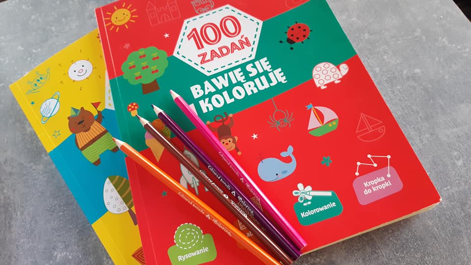 - 100 zadań do rysowania, kolorowania i zgadywania. Fajnie ćwiczą koordynację oko- ręka, uczą kolorów, kształtów, spostrzegawczości itp. 3+ i 5+