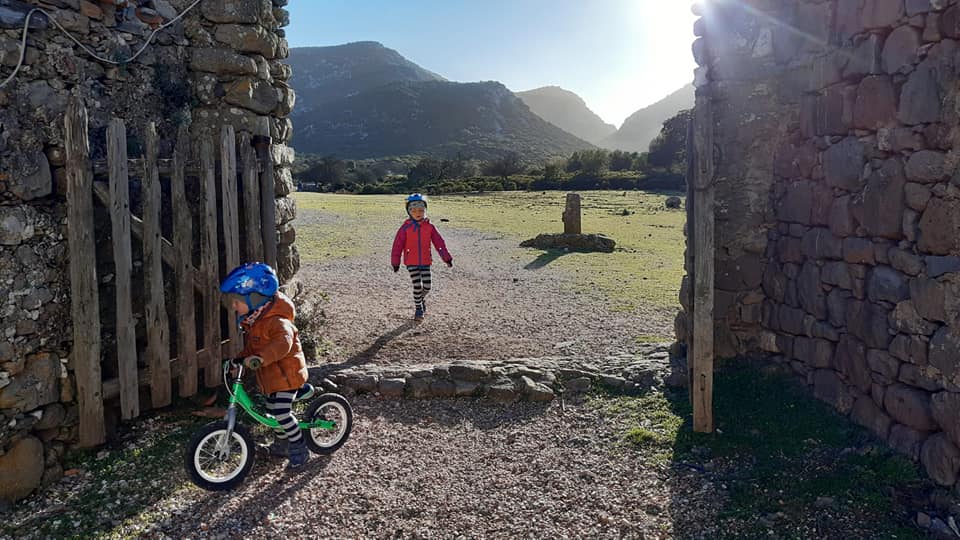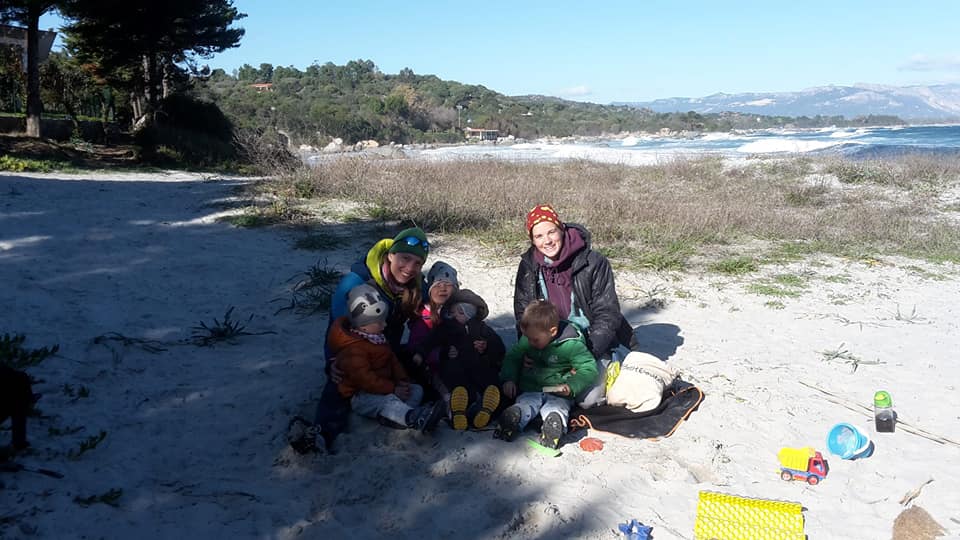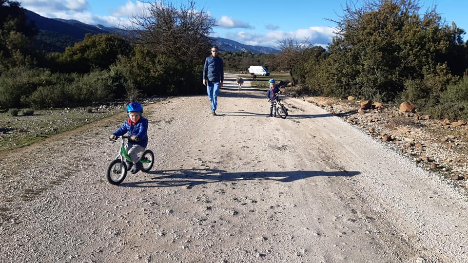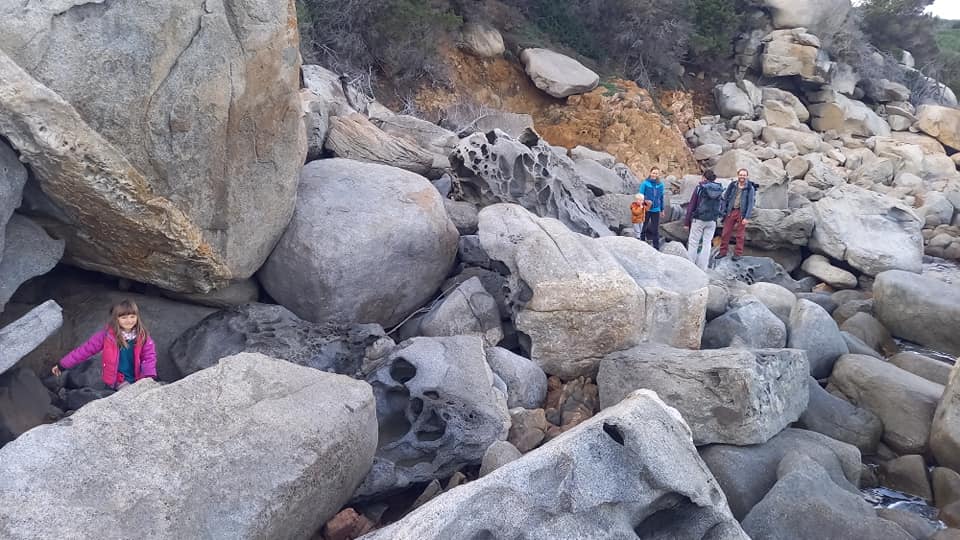 Gdy spotykamy się kilka godzin później, idziemy po skałach, które tworzą wybrzeże w okolicach Arbatax. Dzieciaki wspinają się, skaczą, a my idąc powoli rozmawiamy. Już wiemy, że hardcorami nie jesteśmy. Andrea i Andy jeżdżą mniejszym od naszego VW, z 2ką mniejszych dzieciaków, bez ogrzewania, z turystycznym palnikiem i pieluszkami wielokrotnego użytku. WOW!!! Takie rzeczy uskutecznialiśmy mieszkając jeszcze w Krakowie (pieluszki, bo można je było prać w ciepłej wodzie, której w kamperze nie tyle brak, co jest z nią problem), na długich wyjazdach w 2kę albo krótkich wyjazdach z dzieciakami (palnik turystyczny na benzynę). Ale mieszkać tak w vanie przez kilka miesięcy. Muszę przyznać, że nam, którzy lubimy wyzwania do takiego hardcore’u daleko. Może to wiek? ![]()
