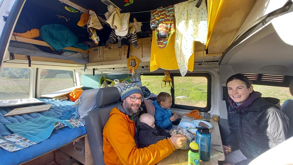 Kupili vana i w drogę. I tu jedna z ważniejszych rzeczy, dla nas strasznie inspirująca. Andrea i Andy mieszkali w Zurychu. Nie trzeba przypominać, że Szwajcaria to jedno z tych państw, gdzie człowiek zarabia godnie. A jednak… Wypowiedzieli umowę najmu. Swoje rzeczy zrzucili do rodziców. Nie byli związani kredytem na kolejne 30 lat. Auta nie mieli, bo w Zurychu komunikacja miejska chodzi…jak w szwajcarskim zegarku! Zastanawiające i chylę czoła, że nie potrzeba było im posiadać dużego mieszkanie albo domu. Nie potrzebowali łechtać swojego ego wielką furą. Dzięki temu byli wolni i mogli zrobić to, na co mieli ochotę – ŻYĆ!!! Rano palnik wyskakiwał na kilka pudeł, szybkie gotowanie i śniadanie (owsianka) ze wspólnego garnka. Wszystko w kurtkach, bo ogrzewania brak. Dzieciaki będą nieźle zahartowane, takiej szkoły życia nie dostaną nigdzie ![]()