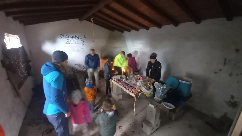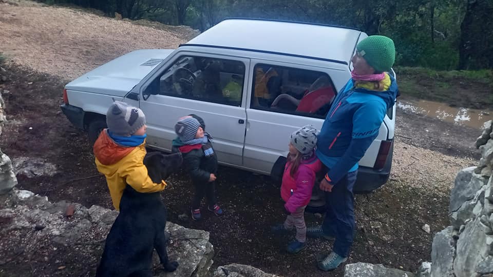 Kilka dni później ruszamy w góry, nasz cel – Monte Tuttavista. Pogoda iście szkocka – chmury, wiatr urywa głowy, a potem mgła i zaczyna padać. Trekking w deszczu z małymi dziećmi nie jest przyjemny. Szczególnie, że suszenie rzeczy w vanie to sztuka