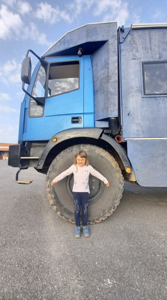 Podczas tego mało turystycznego zimowego okresu spotkaliśmy naprawdę ciekawych ludzi. Jedno ze spotkań na długo, a może na zawsze zapadnie nam w pamięci. Rodzina 2+2, z nastoletnimi już dziewczynami w podróży od 4 lat 🙂 Zatrzymaliśmy się w małej miejscowości, żeby zatankować wodę i zrobić pranie. Z kranika ledwo ciekło, jednak ciekło 🙂 Nigdzie przecież się nie spieszyliśmy, więc leniwie krzątaliśmy się koło vana. W pewnej chwili słyszę, że za nami zaparkowało coś…znacznie większego 🙂 Gdy spojrzałem na opony zrozumiałem jak bardzo wielkiego haha Przywitanie, rozmowa i już po chwili umawiamy się na wspólną nockę na dziko.