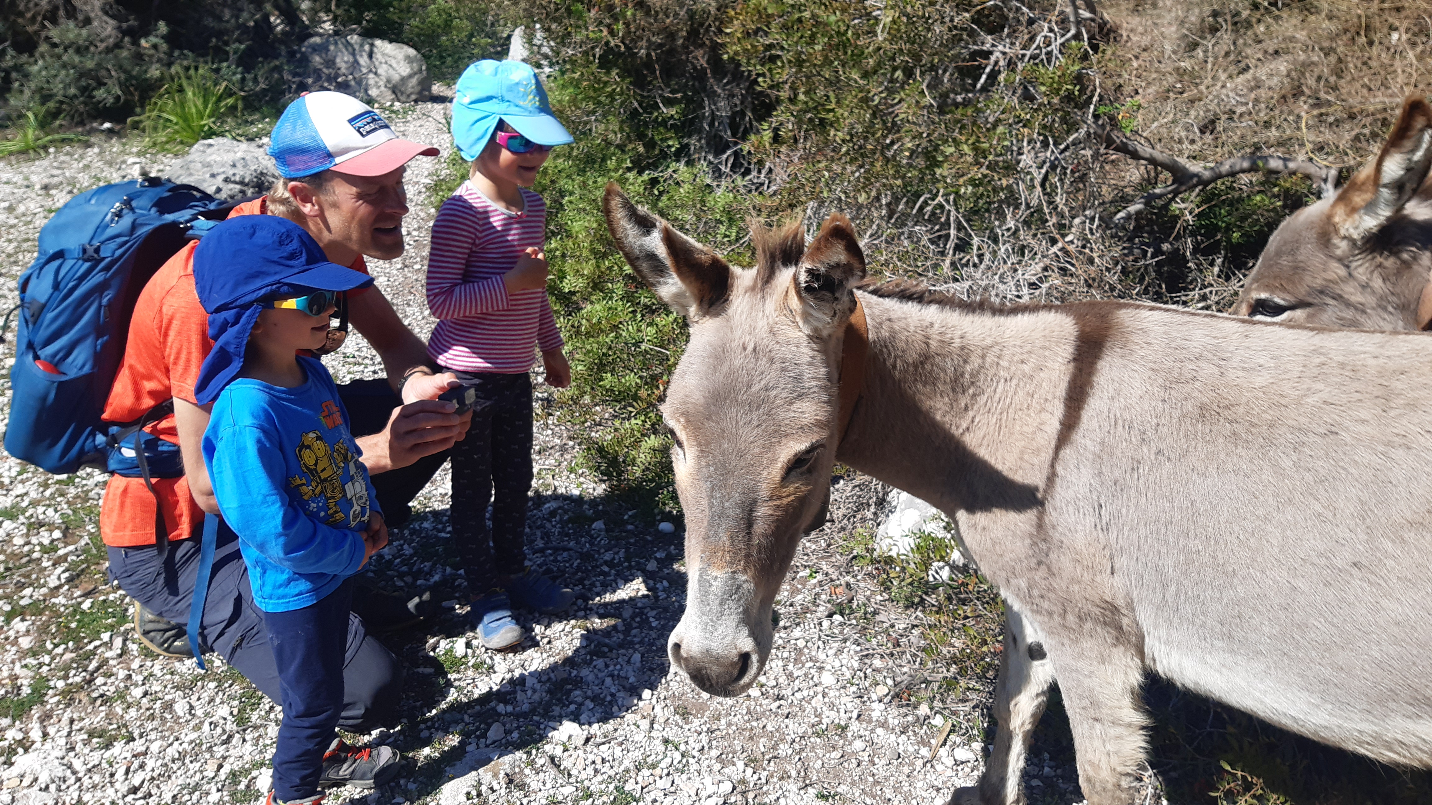 No i spróbowaliśmy 🙂 Zebraliśmy się z rana by już za chwilę dotrzeć do Pedra Longa. Sam dojazd zapierał dech w piersiach. Ruszamy szlakiem ciągnącym się w kierunku północnym. I w tym miejscu dużym zaskoczeniem są wszechobecne kozy i krowy, które pomimo dość stromych zboczy (kozy to jeszcze rozumiem, krowy są pod tym względem ewenementem – polska by sobie nie poradziłą haha) bardzo zwinnie biegają to w górę, to w dół. Co jakiś czas potrzebujemy przeganiać mućkę z wąskiej ścieżki 🙂 To tu drugi raz natykamy się na olbrzymie kleszcze. Zatrzymujemy się koło rodziny osiołków. Po ich przyjacielskim porannym witaniu nas na płaskowyżu Golgo kilka tygodni wcześniej Malika i Mandela tulą się do nich z całych sił. Przyglądam się z daleka, potem podchodzę bliżej i widzę, jak ogromne kleszcze chodzą sobie po sierści zwierzaków. Ciarki przechodzą po plecach. Choć może to i lepiej, że są takowych rozmiarów. Kiedyś, jeszcze za czasów mieszkania w Krakowie, kiedy Malika załapała pierwszego kleszcza w życiu, wyśmiano Natalię na pogotowiu (wtedy jeszcze nie mieliśmy lassa przy sobie). Pierw pielęgniarka, potem lekarz z denkami od butelek na nosie. Jednak miło przeprosił Natalię, gdy w końcu wziął lupę (Natalia uparła się i powiedziała, że nie wyjdzie) i dostrzegł 0.5 mm larwę kleszcza. Więc tu, na Sardynii przeglądanie dzieciaków i nas szło szybko. Łatwo wyłapać coś, co ma ok 0.5-1 cm 🙂