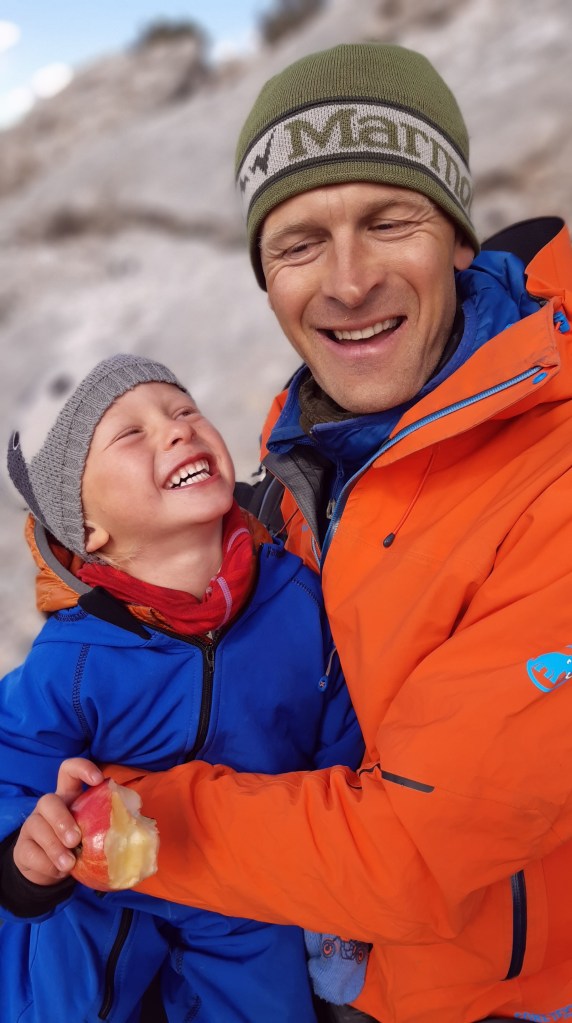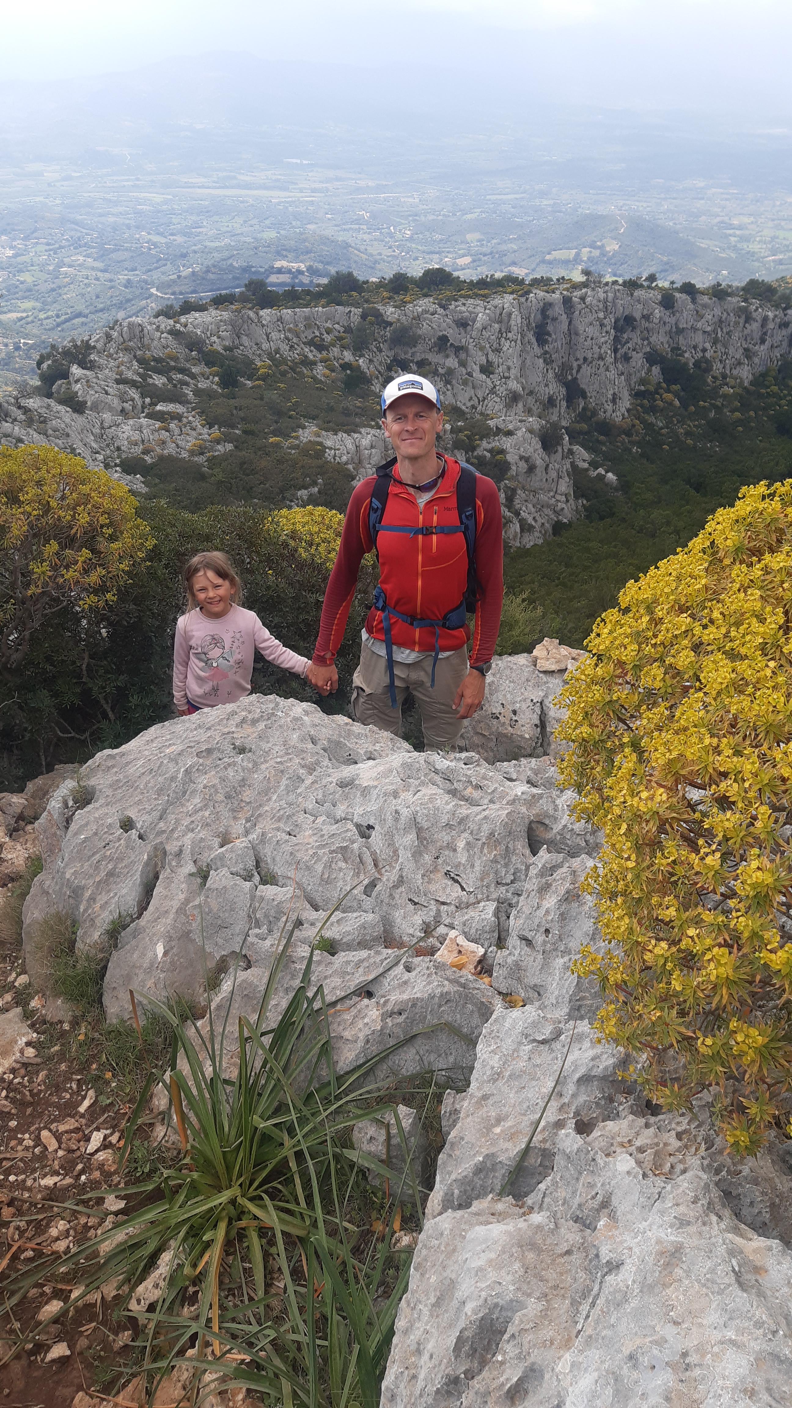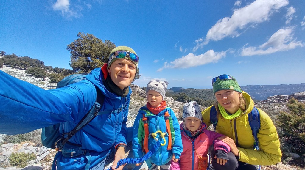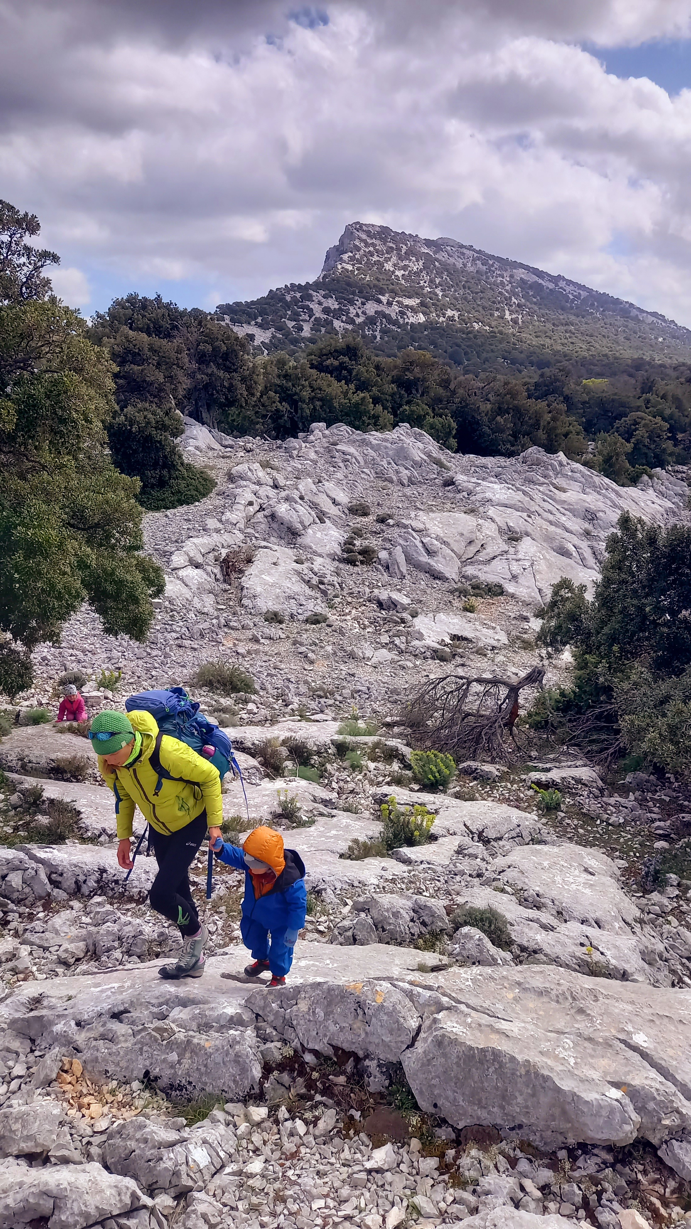 Od czasu do czasu gubię kopczyk i idziemy na czuja. W końcu po kilku godzinach docieramy do Punta Cucuttos, gdzie na końcu mieści się punkt widokowy, skąd z góry można podziwiać ściany nad kanionem Gorropu. Było warto się tu pchać. Dzieciaków nie ciągniemy już na widok, z Natalią wybieramy się tam na zmianę. Trochę wcześniej znajdujemy zaciszne miejsce osłonięte od wiatru. Ubieramy się we wszystko, co mamy jeszcze w plecakach i wyciągamy termosy z ciepłym żarciem i herbatą. Spędzamy 20 min przytuleni do siebie zajadając w ciszy, kilka fotek i trzeba ruszać dalej. Przed nami podejście, a potem zejście. Po drodze słuchamy nagranego wcześniej audiobooka: ‘Przygody pirata Rabarbara’ 🙂