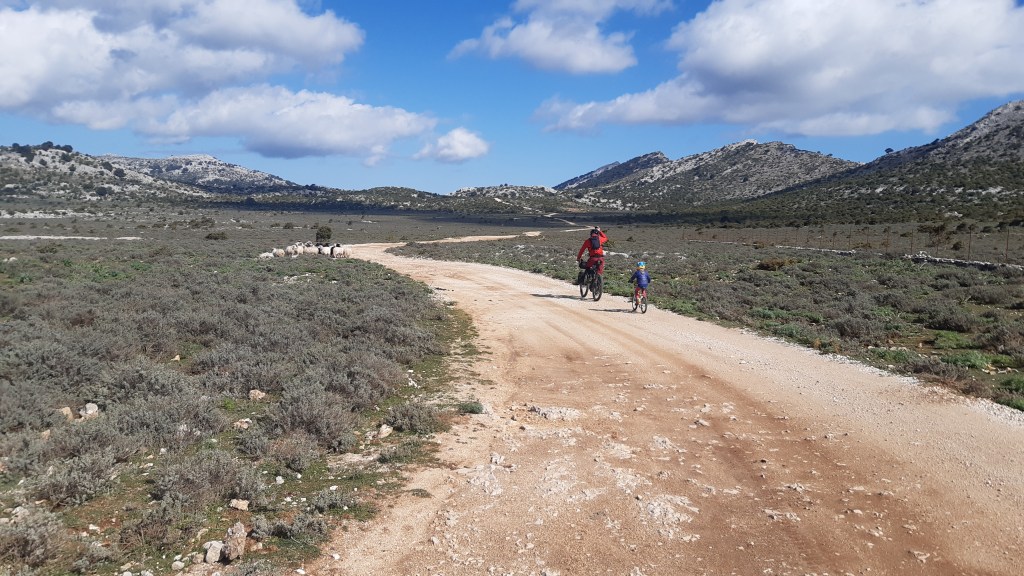 Po 10 km docieramy do leśnego parkingu Sedda Ar Baccas skąd szlakiem można dalej zejść do kanionu Gorropu. My jednak zdejmujemy sakwy, zakładamy wszystko, co mamy i siadamy na słońcu. Gorący posiłek, ciepła herbata stawiają nas na nogi. Dzieciaki latają po skałach, my zasiedliśmy, żeby trochę odpocząć. W tą stronę na szlaku nie spotkaliśmy nikogo. Dwa w jednym – błogosławieństwo i przekleństwo. Być w tych miejscach i mieć je tylko dla siebie, bez tłumów, hałasu to wielki skarb. Vana można parkować gdzie się chce, a nie między kilku albo kilkudziesięcioma innymi. Nikomu nie przeszkadzamy. Raczej szybko taka sytuacja się nie powtórzy 🙂 Z drugiej strony do miast nic nas nie ciągnie. Restauracje pozamykane, muzea zamknięte, festyny i święta odwołane. Nawet kafejki, bez których trudno sobie wyobrazić życie Włochów albo Sardyńczyków, kawę sprzedają na wynos. Kilka dni wcześniej zjeżdżając z Triei natrafiamy na położoną na odludziu, wśród pól restauracje. Pedałujemy już kilka godzin więc coś treściwego przydałoby się wrzucić na ruszt. Do ogrodzenia podchodzi właścicielka, która płynną angielszczyzną przeprasza nas i mówi, że COVIDo-zamknięte ehhh. Pewnie w swoim gronie dalej się spotykają na kolacjach, to dla obcych nie ma wejścia. Ślinka kapie mi z ust. Może następnym razem.