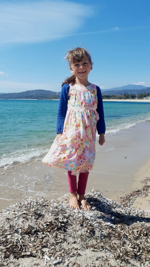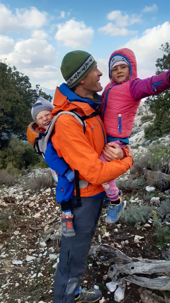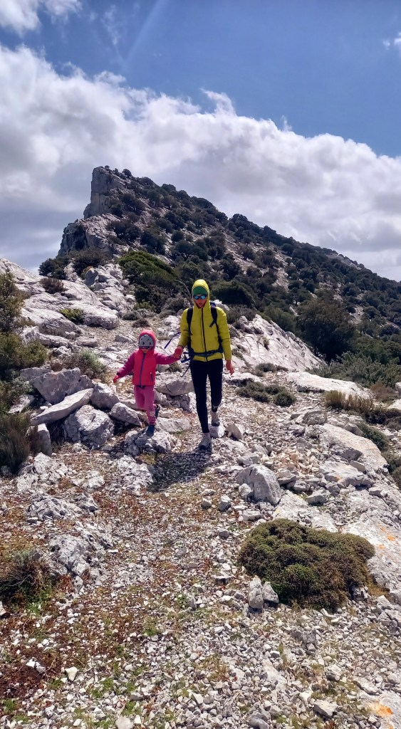 Przy ostatnim zejściu kopczyki gubią się szybko, a na około eksponowane skały. Łapię trochę stresa. Z Mandelą na plecach, chwilę później za rękę. Jak się pogubimy, będziemy potrzebowali wytrawersować do ścieżki, którą wchodziliśmy 8h wcześniej. Albo wrócić do góry. Dzieciaki narzekają na bolące nogi. Mi zresztą też już się nie chce. F**k! Wolę jednak trafić na dół za pierwszym razem. Ponownie @mapy.cz przychodzą z ratunkiem. Gdy widzimy już w dole ścieżkę zaczynamy podbiegać by za chwilę znaleźć się koło vana. Malika całą trasę przechodzi na własnych nogach. Twarda dziewczyna! 🙂 Ściągamy buty trekkingowe by choć trochę, one i stopy, przewietrzyły się na świeżym powietrzu 🙂 Nic mi się już nie chce, a przed nami jeszcze kręta górska droga do Santa Maria Navarrese.
